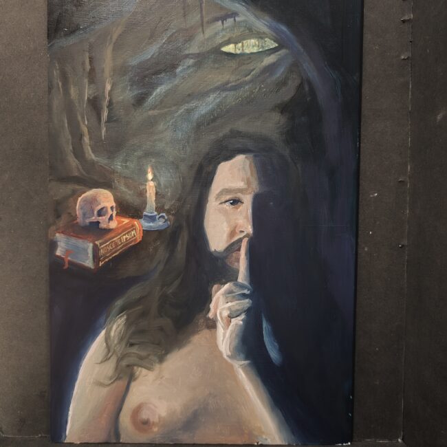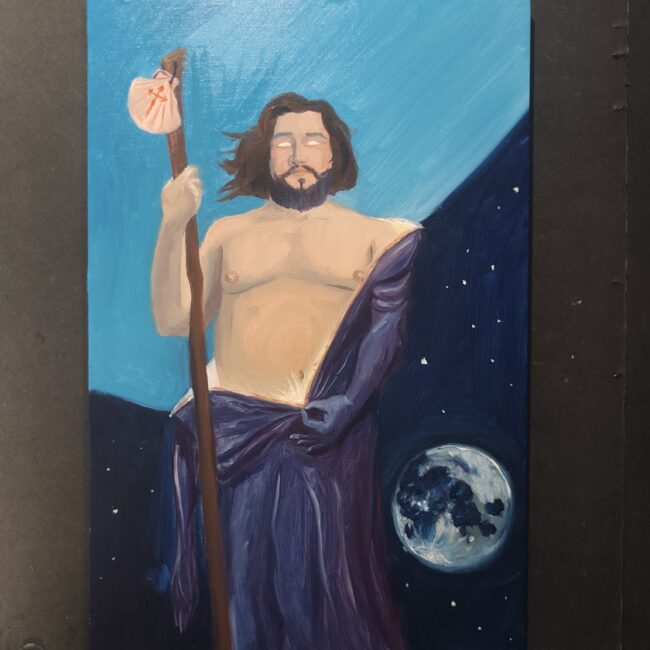 Sur la troisième toile, commence la pèlerinage. Inspirée par la symbolique du Chemin de Saint-Jacques, cette œuvre parle du détachement et de la libération. Le pèlerin laisse derrière lui les anciennes peaux, les masques, les peurs et les croyances qui ne lui servent plus. Chaque pas est un acte d’abandon et de vérité. C’est le dépouillement qui précède la lumière.