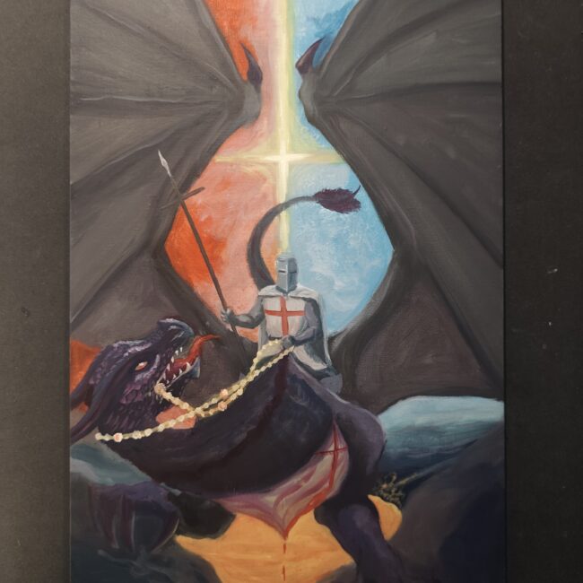 Sur la cinquième toile, le dragon apparaît enfin apprivoisé. Non plus comme une menace, mais comme une force vitale intégrée. L’être apprend à le chevaucher — symbole de la condition humaine et de ses instincts — et à utiliser le feu qui jadis le consumait comme énergie créatrice. Manger, dormir, éprouver du plaisir, souffrir… tout devient expression d’une même essence. L’âme apprend à vivre pleinement dans le corps.
